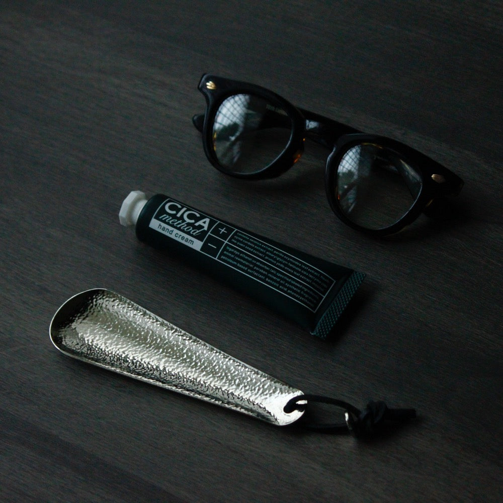 日本の職人が丹念に打ち出し加工を施した真鍮製シューホーン。鍛えることで強度を増したシューホーンは乱反射する黄金色の光をもとうように存在感を放つ。古くから用いられてきた伝統技法をデザインに昇華させた意匠をもつシンプルなシューホーン。13cm 3色展開。